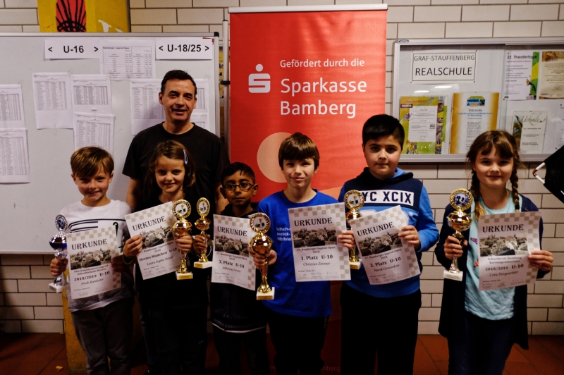 Die Oberfränkische Jugendschnellschach-Einzelmeisterschaft wurde zum zwölften Mal im Rahmen des Bamberger Jugend-Opens in der Graf-Stauffenberg-Realschule durchgeführt. Von den insgesamt 154 Teilnehmerinnen und Teilnehmern waren 67 aus Oberfranken. Nach sieben Runden Schnellschach bei einer Bedenkzeit von 20 Minuten pro Spieler und Partie konnte Bezirksjugendleiter Tobias Pfadenhauer folgende Meister ehren: